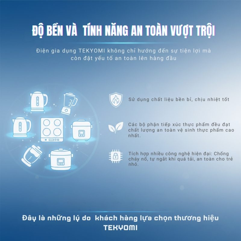 Điện gia dụng Tekyomi không chỉ hướng đến sự tiện lợi mà còn đặt yếu tố an toàn lên hàng đầu.